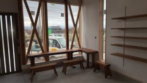 現在建築中の藍染工房 室内のテーブルやスツールもウザワが造作させていただきました